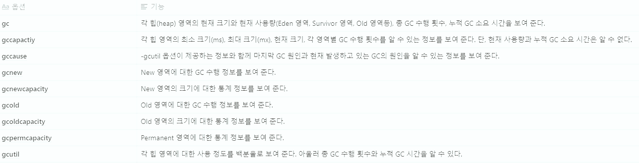 jstat은 GC 수행 정보를 보는 기능만 제공하지는 않는다. 클래스로더 수행 정보나 Just-in-Time 컴파일러 수행 정보 등도 jstat으로 알 수 있다. 여러 정보를 얻을 수 있지만 이 글에서는 GC 수행 정보 모니터링에 대해서만 알아보겠다.