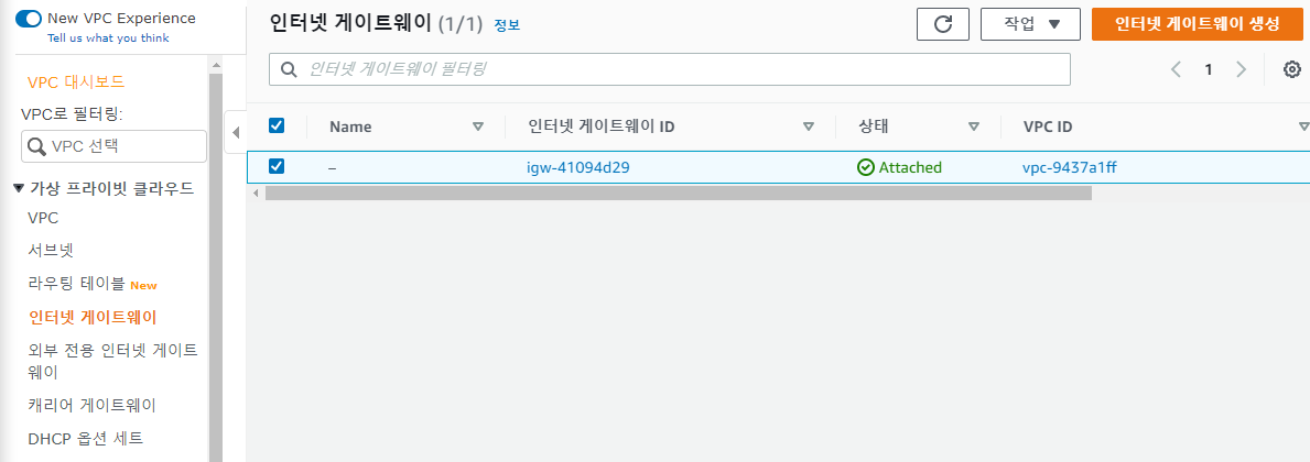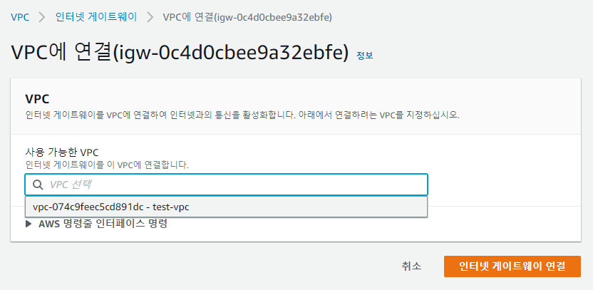 인터넷게이트웨이를 만든다고 해서 다 끝난게 아니라 이 인터넷게이트 웨이를 VPC와 연결을 해줘야 한다.