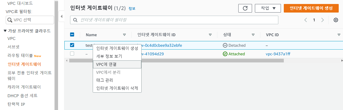 생성한 인터넷 게이트웨이를 우클릭 하여 VPC에 연결을 클릭한다.