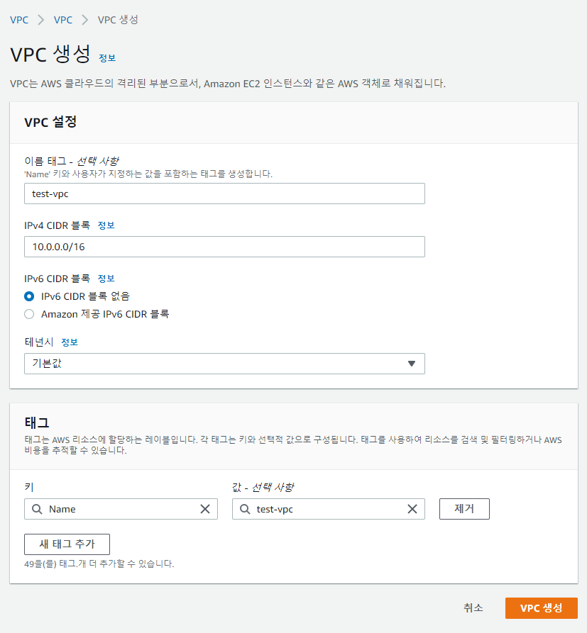 - IPV6는 만들 필요가 없으므로 IPV6 CIDR 블록없음을 선택 한다.