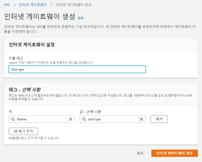 - VPC 및 기타 다른 서비스를 생성할때 태그를 다는 습관을 들이면 좋을 것 같다.