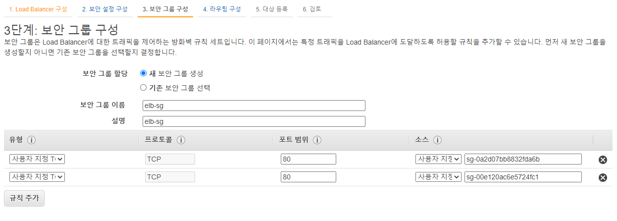 보안그룹 생성시 새 보안 그룹을 선택하고 80번 포트에 대해 public-sg와 private-sg를 인바운드로 넣어준다.