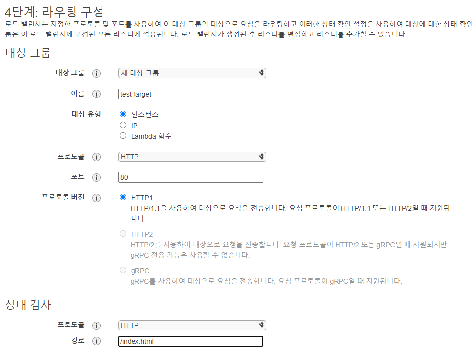 대상그룹의 이름을 test-target으로 설정하고 상태검사에 index.html 을 작성한다.