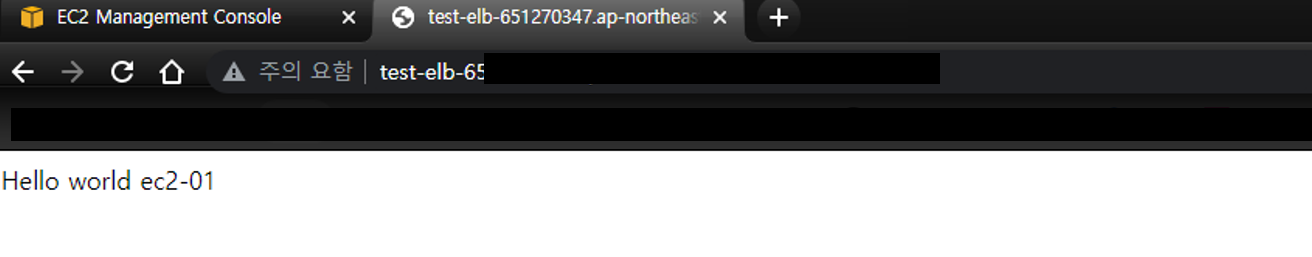그런다음 로드밸런서 메뉴에서 DNS 이름을 복사한후 인터넷 새창에서 입력 후 엔터를 치게 되면 아래와 같이 PRIVATE SUBNET에 생성 해둔 index.html 파일이 호출되는 것을 알 수 있다.