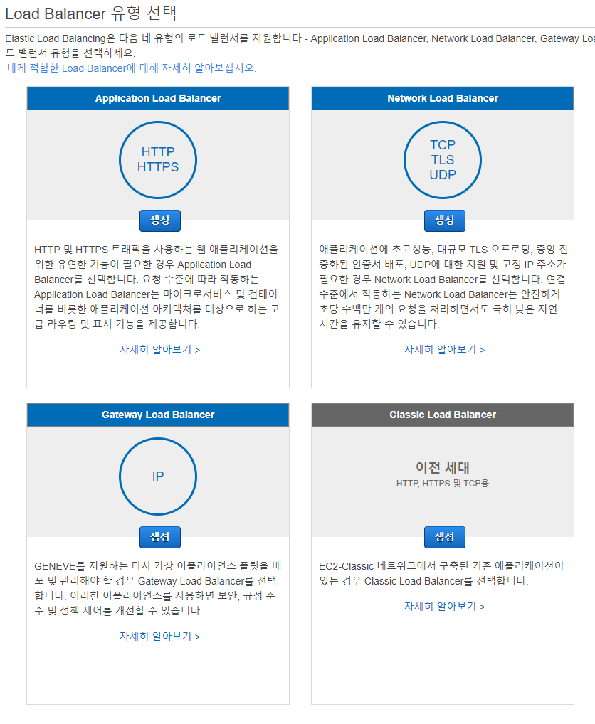 - NLB(Network Load Balancer) : 애플리케이션에 초고성능, 대규모 TLS 오프로딩, 중앙 집중화된 인증서 배포, UDP에 대한 지원 및 고정 IP 주소가 필요한 경우 사용