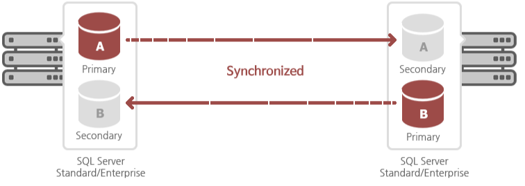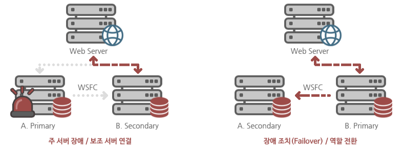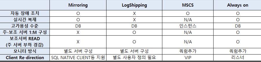 기존 DB 미러링 구성과 달리 모니터링 서버가 필요 없으며, 장애 조치 클러스터 (WSFC)를 이용하여 자동 장애 조치를 지원한다.