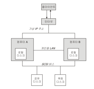 두 개의 시스템 클러스터는 가상 IP 주소를 사용하여 클라이언트 액세스를 위해 네트워크에 공동으로 연결된 두 개의 컴퓨터(예: A와 B)로 구성된다. 또한 한 개 이상의 사설 네트워크에 의해 서로 연결될 수도 있으며, A와 B는 각각에 있는 서버 애플리케이션이 최소한 한 개의 디스크를 공유하여 사용한다.