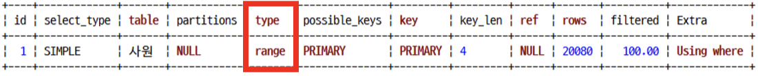 | 1 | SIMPLE | 직급 | NULL | index | PRIMARY | PRIMARY | 159 | NULL | 442961 | 10.00 | Using where; Using index |