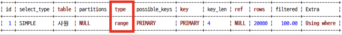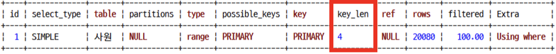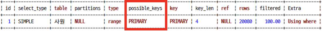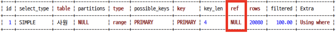 | 1 | SIMPLE | 사원 | NULL | const | PRIMARY | PRIMARY | 4 | const | 1 | 100.00 | NULL |