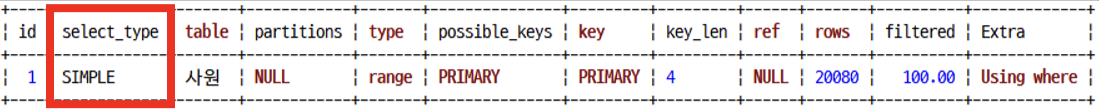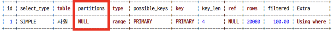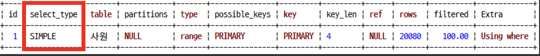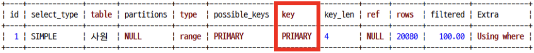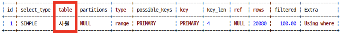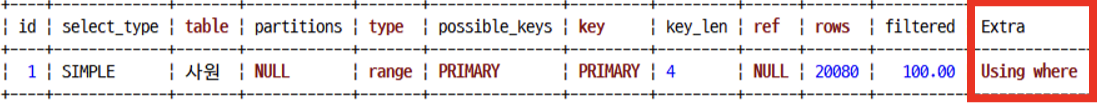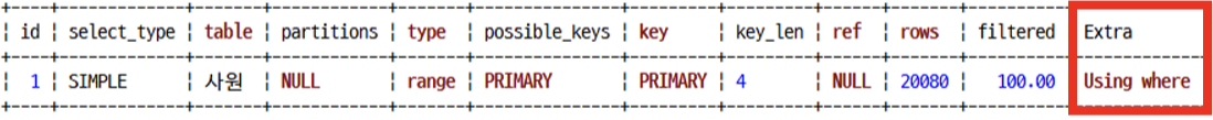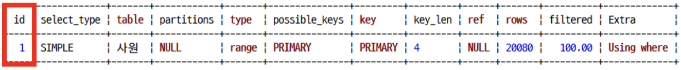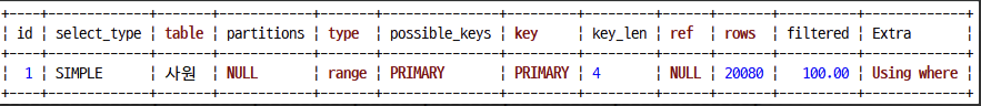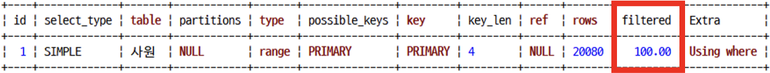 | 1 | PRIMARY | 사원 | NULL | const | PRIMARY | PRIMARY | 4 | const | 1 | 100.00 | NULL |