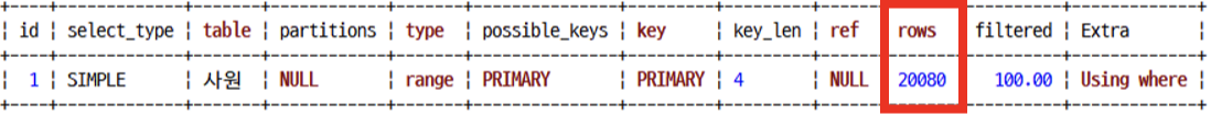 | 1 | SIMPLE | 사원 | NULL | ALL | NULL | NULL | NULL | NULL | 299157 | 100.00 | NULL |