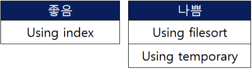 - 이미 정렬된 인덱스를 사용하면 추가적인 정렬 작업이 필요없지만 인덱스를 사용하지 못할때는 정렬을 위해 메모리 영역에 데이터를 올리게 되는데 Using fileosrt는 추가적인 정렬 작업이므로 인덱스를 활용하도록 SQL 튜닝 대상이 될 수 있음