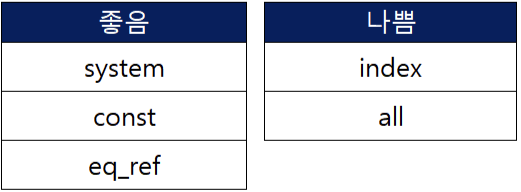 - ALL 유형일때는 인덱스를 새로 추가하거나 기존 인덱스를 변경하여 인덱스를 활용하는 방식으로 SQL튜닝을 할 수 있으나 전체 테이블 중 10~20% 이상의 분량의 데이터를 조회할때는 ALL 유형이 오히려 성능상 유리할 수 있음