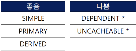 - SELECT 문이 단순히 FROM절에 위치한것인지, 서브쿼리인지, UNION절로 묶인 SELECT인지의 정보를 제공함