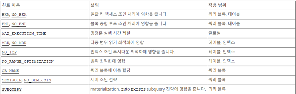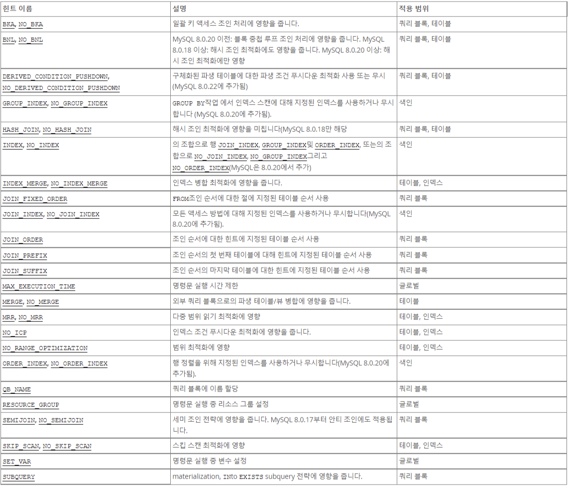Mysql 서버에서 사용 가능한 쿼리 힌트는 2가지로 구분 할수 있다