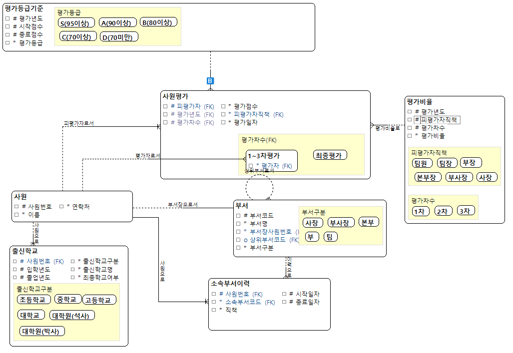 이부분은 평가년도별로 평가비율을 별도 테이블로 관리를 해야 하며 피 평가자의 직책, 평가 차수에 따라 비율이 달라지기 때문에 PK 구성을 평가년도, 피평가자직책, 평가차수 로 구성해야 한다는것을 의미 한다. 평가 관련된 부분의 엔터티 구성이 사실 좀 어려웠다. 따라서 모범답안에는 없지만 나의 답안에는 평가라는 엔터티를 만든걸 볼수있다. 뭔가 평가의 마스터 엔터티가 필요하다고 판단되서 그렇게 만든건데 모범답안을 보고 나니 굳이 만들 필요는 없겠다는 생각도 들었다.