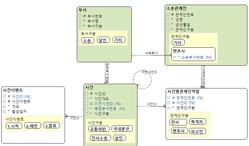 이부분을 보고 많은 고민을 했다. 소송관계인 한명이 한 사건에 하나의 역할만 한다는 제약조건 같은것이 모델로 어떻게 표현해야 하나 했던것이다. 모범 답안을 확인 해보니 사건별관계인역할 엔터티를 생성했다. 내가 문제를 잘못 이해한 부분이 있었다. 나는 사건당 소송관계인이 발생하면 소송관계인번호를 채번한다고 생각을 했는데 모범 답안을 보니 소송관계인은 사람을 식별하는 식별값이었던 것이다. 애초에 문제에서 그런식으로 이해를 했더라면 나도 모범답안처럼 관계인역할 엔터티를 도출했을텐데 문제 이해능력이 떨어져서 좀 아쉽다.