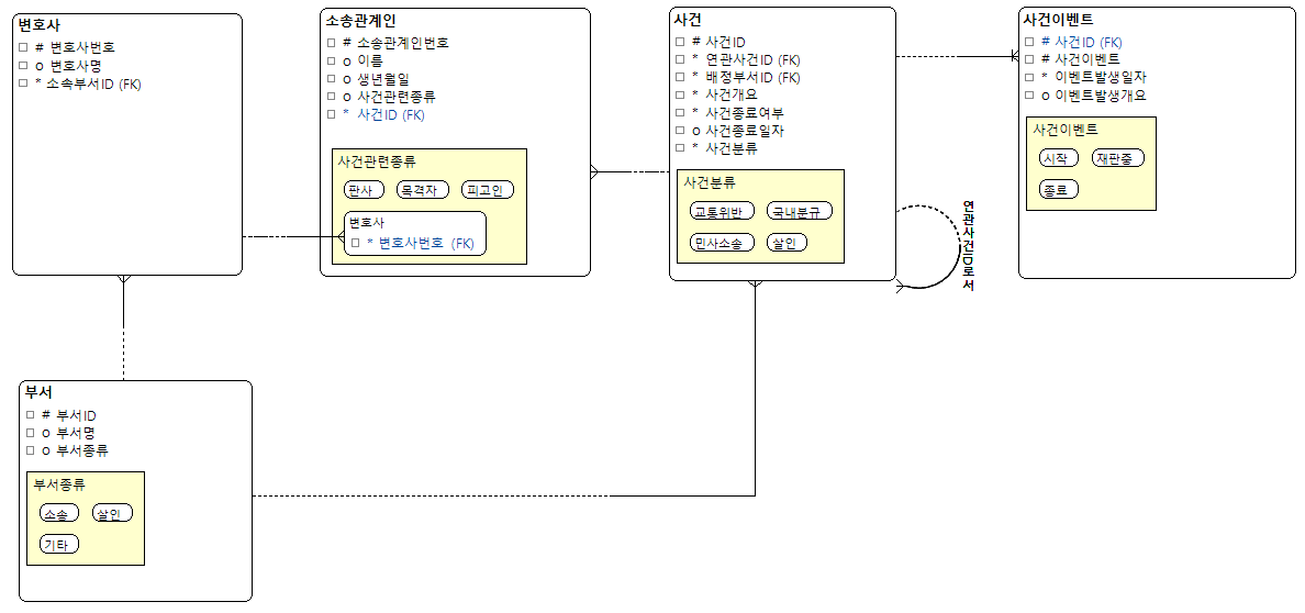 이부분을 보고 변호사 엔터티를 생성해야 한다고 판단 해서 해당 엔터티를 만들고 소속부서ID를를 통해 부서 엔터티와 관계 설정을 하였지만 모범답안을 보고 나니 해당 문구의 의미가 변호사 엔터티를 별도로 생성할 필요가 없다는것을 의미 한다는 것을 알게 되었다.